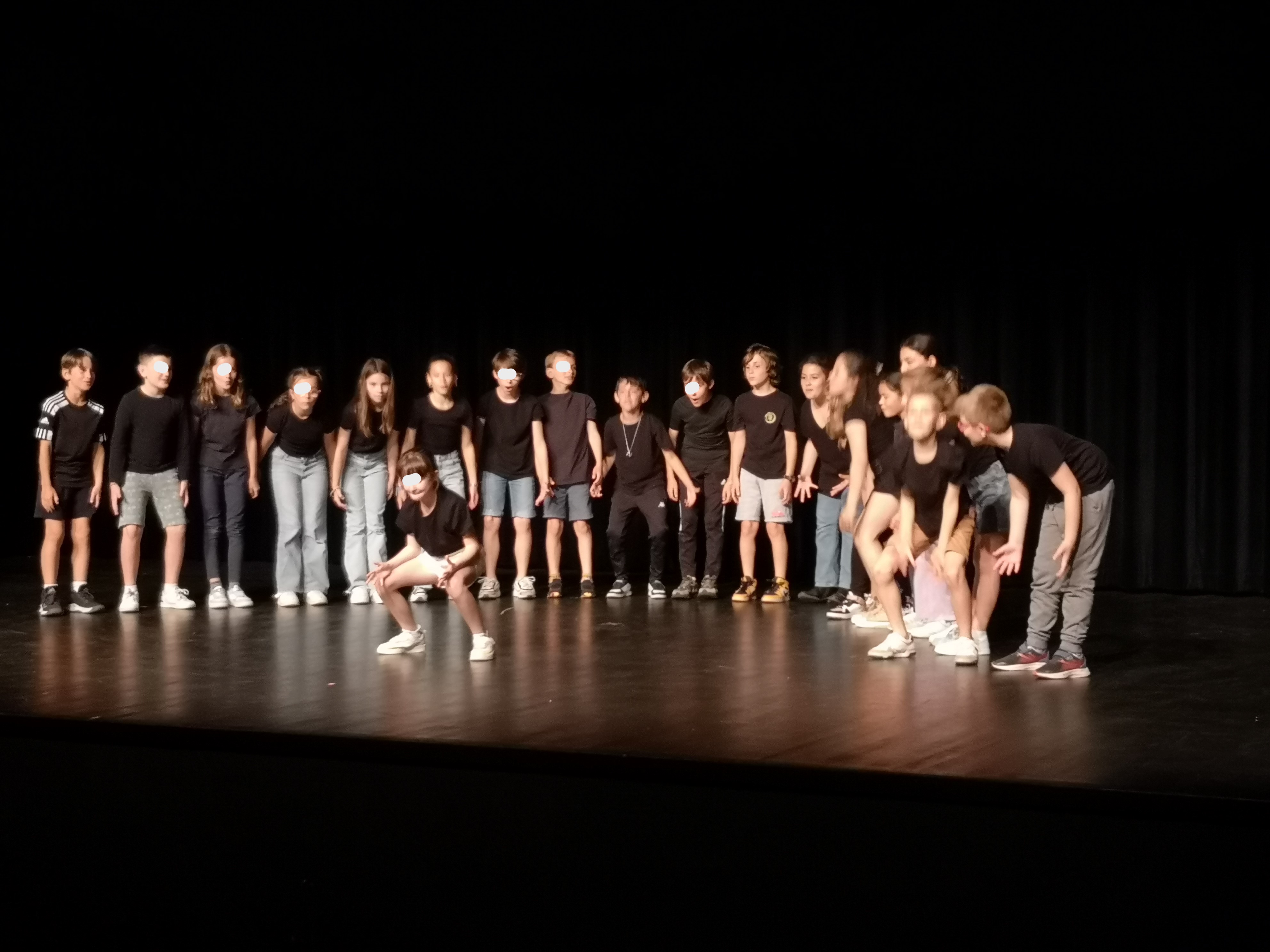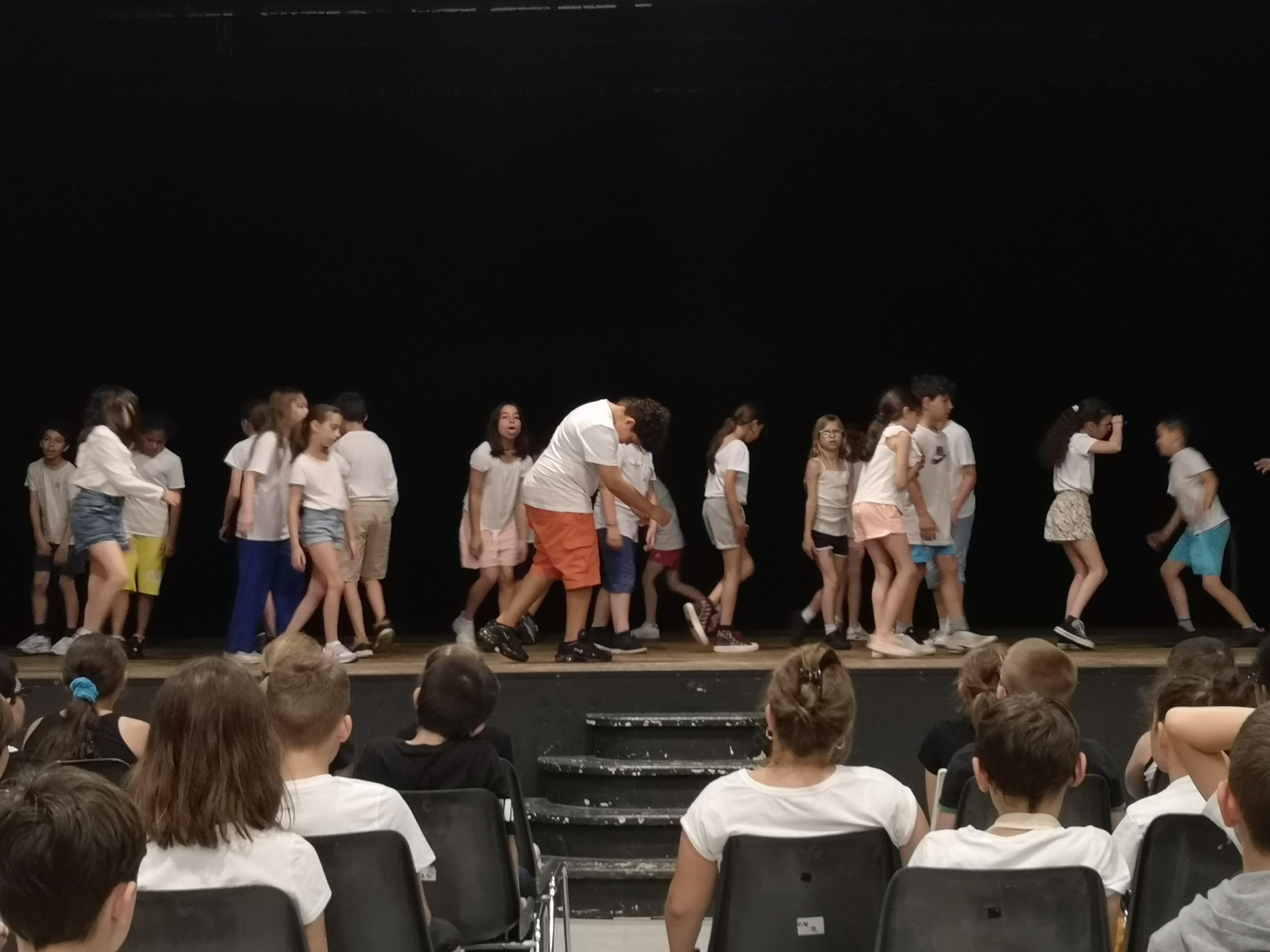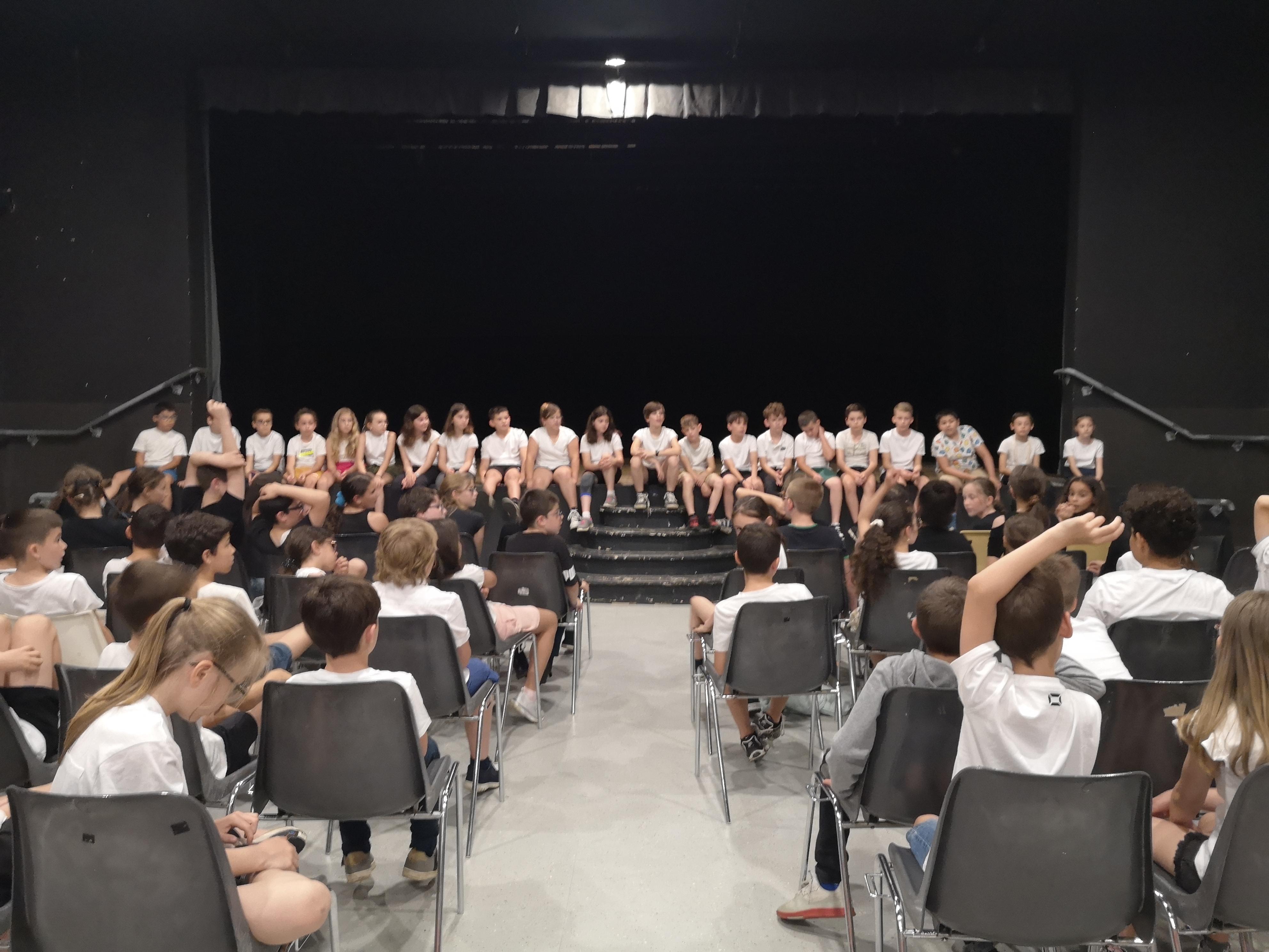 Les classes ont d'abord suivi une matinée avec quatre ateliers tournants pendant lesquels ils ont pu appréhender l'espace scénique, observer une classe répéter, et (selon les jours) faire des jeux de connaisance, discuter autour des droits des enfants ou bien encore aborder des jeux musicaux. Et puis après un pique nique, les 4 classes ont tour à tour montré au public l'aboutissement de leur travail.